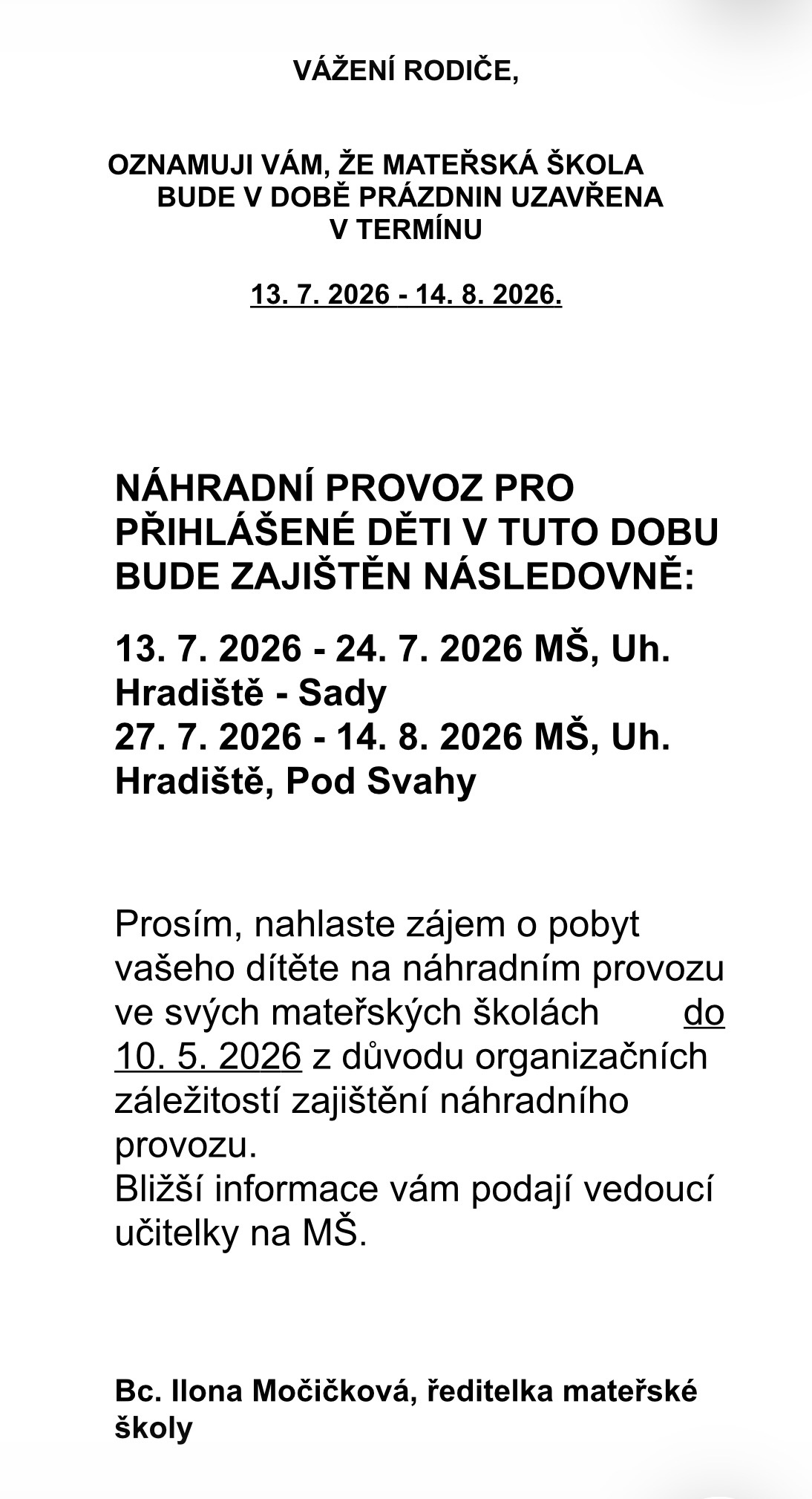 UZAVŘENÍ MATEŘSKÉ ŠKOLY O PRÁZDNINÁCH 2026
